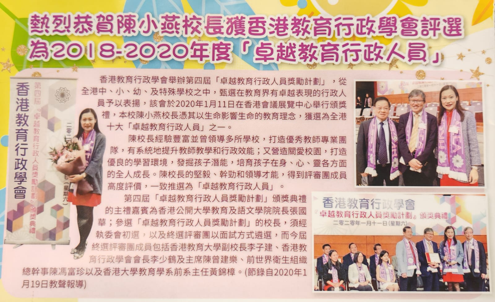 為提升學生的學習興趣及增加課堂參與,教師將於課堂中,運用更多不同的小班教學策略,如合作學習、電子學習、閱讀中學習等。教師透過合作學習的「四高課堂」,即「高動機、高參與,高展示、高回饋」的教學策略,照顧學生的學習差異,提升學生學習動機及課堂參與度,從而提升學習表現。透過課堂的小組活動及師生互動,將有效提升孩子的溝通能力、小組合作以及個人自信。 我們將以教育孩子成材,扶持他們成長為依歸,為他們營造最佳的學習環境,在充滿關愛的校園成長,培育出品學兼優的新一代。學校就是孩子的第二個家,能給予他們成長中所需要的支持和鼓勵,讓他們以正面的態度面對成長的困難與挑戰。教師將按孩子的個性與潛質,提供嘗試和發揮機會,讓孩子獲得更多不一樣的成長經歷。透過服務學習、體藝及團隊參與、校外比賽機會等,加強孩子多元發展,提升自尊自信。盼家長也能配合,多鼓勵孩子積極參與課堂及課堂以外的活動,多肯定孩子,給予孩子發揮的空間。 學校的成功,有賴家長的支持。學校將透過不同的機會,增加老師和家長間的交流,加強家長合作,一起關心學生成長。九月份我們將透過分級家長會,讓家長了解孩子升級後的各項轉變,認識各級課程特色及活動安排,陪伴子女成長。家長要照顧工作與家庭,絕不容易。學校亦會舉辦不同的家長活動,讓家長認識更多子女成長需要以及親職管教技巧。期待大家能積極參與家長義工服務、家教會活動、家長團契以及家長學堂等活動,讓我們彼此認識,互相分享,互相支持,成為最好的合作伙伴。 新的學年,讓我們帶著新的期盼,見證孩子的成長。帶每天都是新開始,孩子可以做得到的信心,陪伴孩子經歷成長。與你同行,主佑!聖公會九龍灣基樂小學陳小燕校長 我們的校長 陳小燕校長教學年資:26年2024年度起 出任本校校長 曾任:聖公會李兆強小學校長 2019-2024聖公會奉基千禧小學校長 2014-2019大埔浸信會公立學校校長 2009-2014慈幼葉漢小學課程統籌主任 2004-2009天水圍十八鄉鄉委員會公益社小學文憑教師 2003-2004荃灣海壩街官立小學文憑教師 1999-2003 教育專業及社會服務:香港賽馬會創意教育計劃創意教練香港教育局領航教師及校長培訓計劃—領航校長大學擬任校長課程需要分析評估員及行動研究指導員香港女童軍總會觀塘分會主席香港浸信會聯會中學、小學及持續教育部部員荃灣浸信會兒童部部員、兒童團契副團長中學、小學及幼稚園校董香港學界體育聯會九龍東區小學分會籃球主委 成就:2020-2025 連續五屆關愛滿觀塘奬勵計劃(愛學生、愛家長、愛老師)全方位關愛老師嘉許2020香港教育行政學會第四屆卓越教育行政人員獎勵計劃—卓越教育行政人員嘉許2025 表揚教師計劃優秀教師嘉許