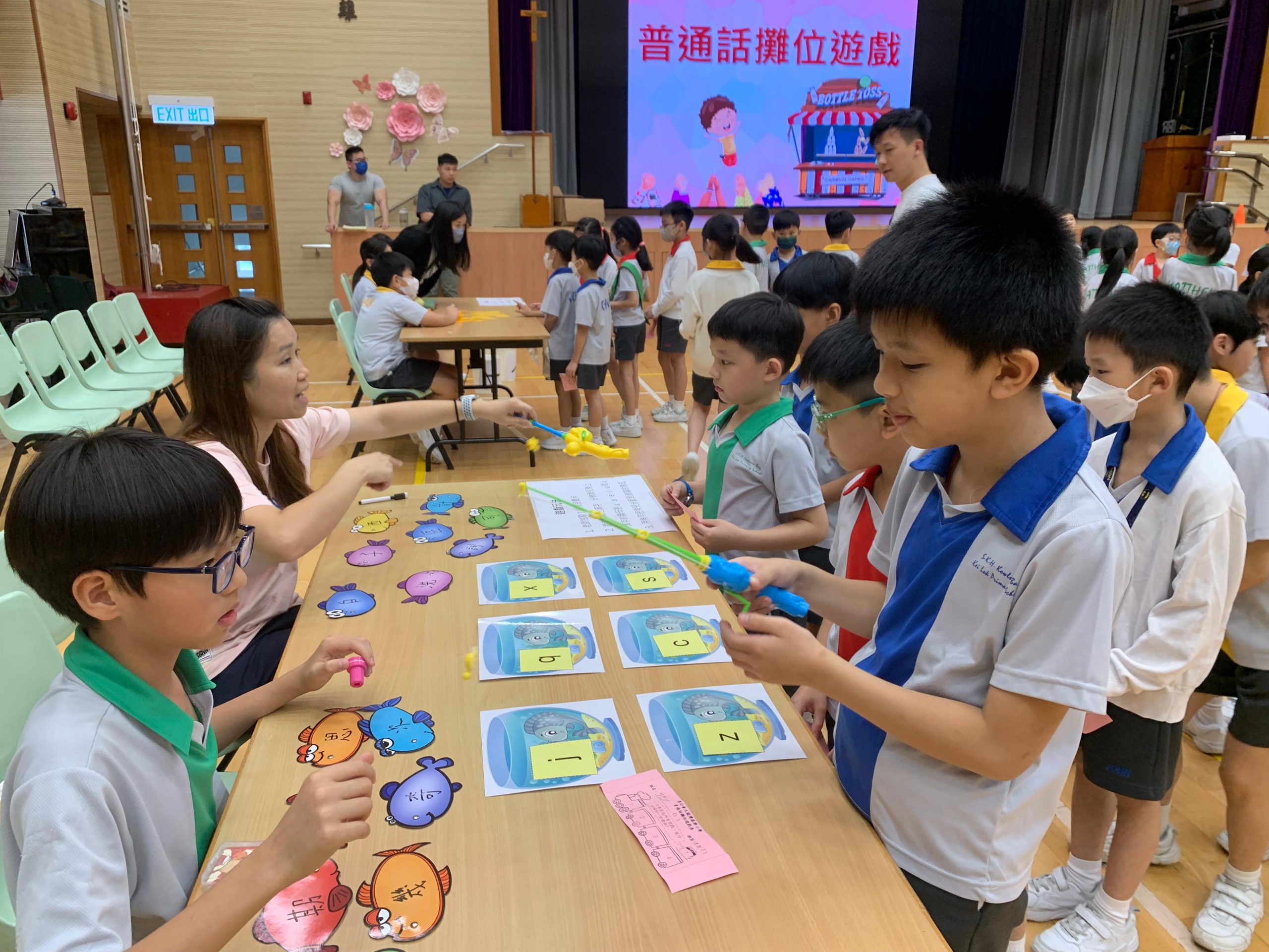 4.營造良好的普通話語境:本校透過每年定期舉辦不同的校園活動,營造普通話語境,例如:「普通話攤位遊戲」、「普通話劇場」、「趣味兒歌創作比賽」、「普通話故事問答比賽」、「用普通話唱謝飯歌」等,讓學生於日常生活中多接觸普通話,從而提升學生說普通話的信心。全校學生二至六年級每班各選普通話大使,負責協助舉辦「普通話日」活動,並於上普通話課前帶領同學朗讀課文、詞語或聲韻母兒歌,以及負責監察唱謝飯歌的情況。